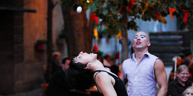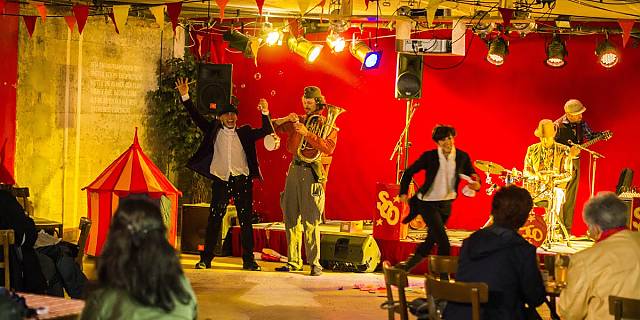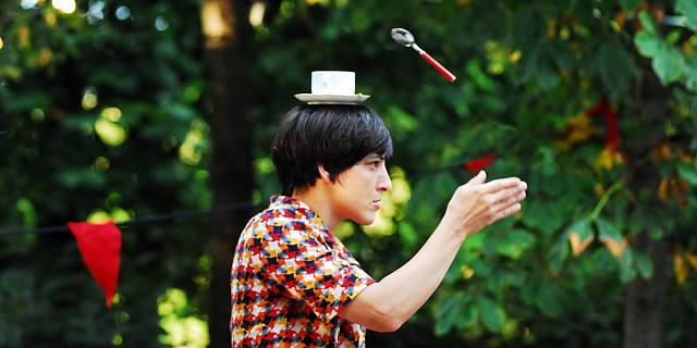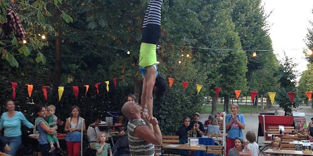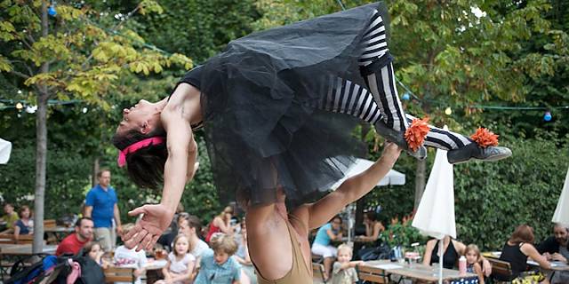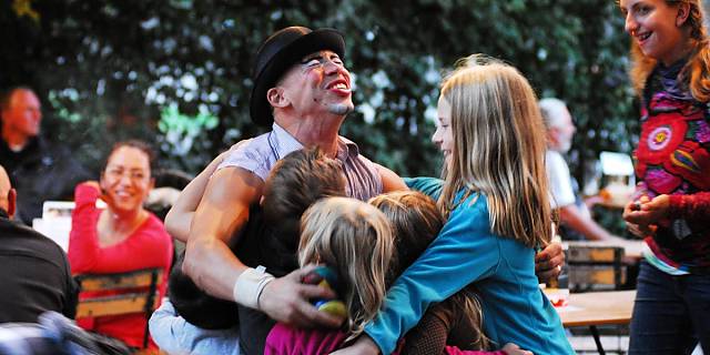 Clownesken Arabesken, exotischer Jonglage, fliegenden Objekten und viel Musik. Und das Alles zwischen und unter den Tischen, auf und neben den Stühlen, in und um die Bäume, wo sie sich vor Lachen an ihrem "Kracherl" verschlucken können, wo sie unerwartet Teil einer Nummer werden, wo es aber auch erlaubt ist so zu tun als wäre nichts geschehen: Secret Circus eben.